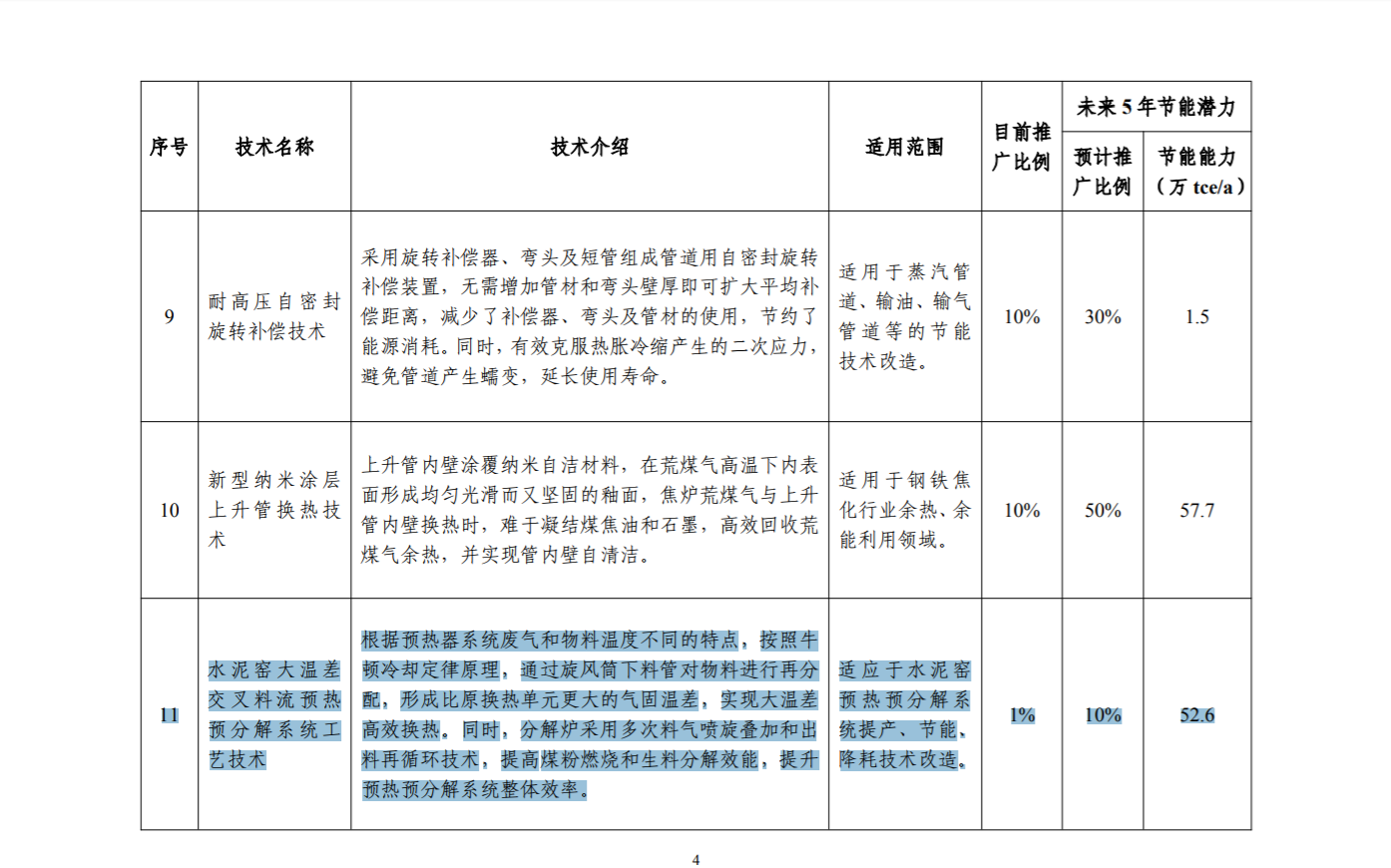 該技術(shù)適應(yīng)于水泥窯預(yù)熱預(yù)分解系統(tǒng)提產(chǎn)、節(jié)能、降耗技術(shù)改造??梢蕴岣呤炝袭a(chǎn)量 10~25%;提高熟料強度 1.0~3.5MPa;降低燒成煤耗 2.9~4.5kgce/t;降低綜合電耗 3.5~5.0kW·h/t;降低廢氣中 NOx含量 100~150ppm。預(yù)計未來 5 年,推廣應(yīng)用比例可達(dá)到 10%,可形成節(jié)能52.61 萬 tce/a,減排 CO2 136.79 萬 t/a。