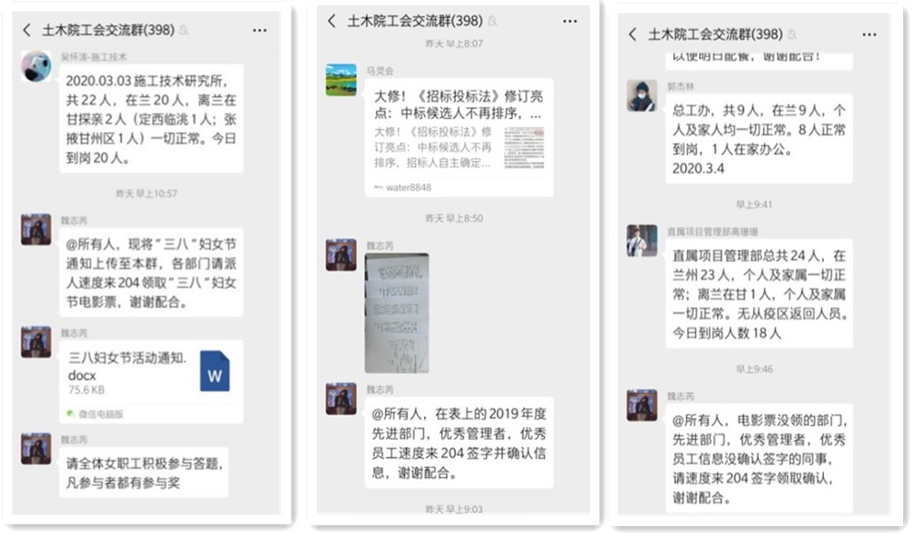 依托微信平臺,加強對公司日常工作管理、信息發(fā)布、疫情發(fā)展趨勢、職工人員信息進(jìn)行收集管理,做好日常管理、防控、監(jiān)督、宣傳工作。