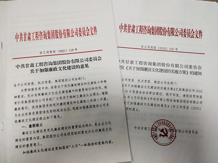 作為新組建的產(chǎn)業(yè)集團,甘肅工程咨詢集團把資產(chǎn)整合、產(chǎn)業(yè)耦合和文化融合作為集團公司組建的重要內(nèi)容,其中讓廉潔文化建設(shè)在企業(yè)文化建設(shè)中先行一步,早安排早部署,2021年9月集團公司黨委研究印發(fā)《關(guān)于加強廉政文化建設(shè)的意見》,在中共中央辦公廳《關(guān)于加強新時代廉潔文化建設(shè)的意見》和省委《實施方案》印發(fā)后,又及時對標、查缺補漏,2022年9月修訂印發(fā)《關(guān)于加強廉潔文化建設(shè)的實施方案》,為新時代集團公司加強廉潔文化建設(shè)提供了指導(dǎo)。自組建以來,集團公司廉潔文化建設(shè)力求在“內(nèi)化于心”上下功夫,在“外化于行”上求實效,引導(dǎo)干部職工廉潔從業(yè),廉潔用權(quán),積極營造“崇廉、尚廉、倡廉、守廉”的企業(yè)風尚和發(fā)展氛圍。