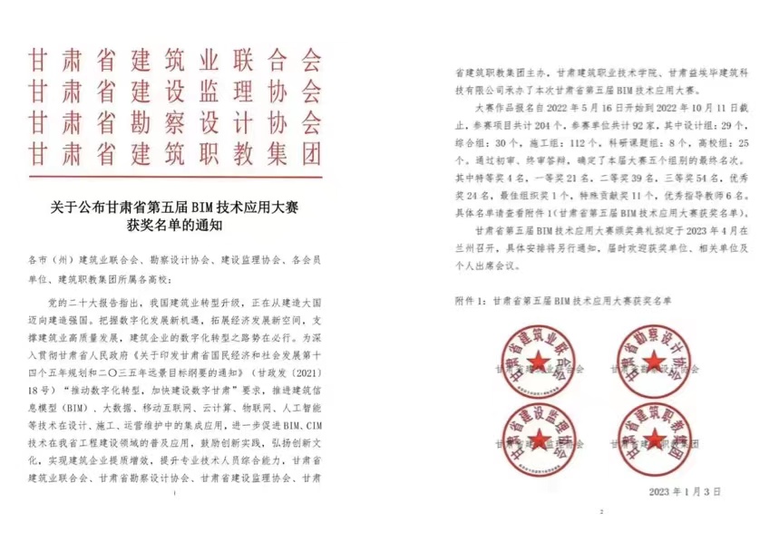 日前,甘肅省第五屆BIM技術(shù)應(yīng)用大賽結(jié)果公布,甘肅工程咨詢集團(tuán)共獲得14個獎項,其中,“BIM技術(shù)在東鄉(xiāng)縣沿洮河經(jīng)濟(jì)帶棚戶區(qū)改造二期(調(diào)整)項目設(shè)計階段的應(yīng)用”等8個項目分別獲設(shè)計組一、二、三等獎,“同心抗疫,智慧建造—甘肅省疾病預(yù)防控制中心公共衛(wèi)生中心項目BIM綜合應(yīng)用”等3個項目分別獲綜合組特等獎及一、二等獎,“數(shù)字化轉(zhuǎn)型背景下的勘察設(shè)計企業(yè)BIM技術(shù)推廣路徑探究”等2個項目分別獲科研課題組二、三等獎,建筑設(shè)計院獲特殊貢獻(xiàn)獎。