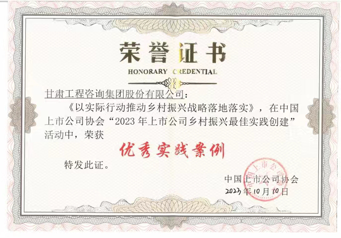 近日,在中國(guó)上市公司協(xié)會(huì)主辦的上市公司鄉(xiāng)村振興經(jīng)驗(yàn)交流會(huì)暨最佳實(shí)踐案例發(fā)布會(huì)上,由甘肅工程咨詢集團(tuán)申報(bào)的鄉(xiāng)村振興實(shí)施案例榮獲“優(yōu)秀實(shí)踐案例”。