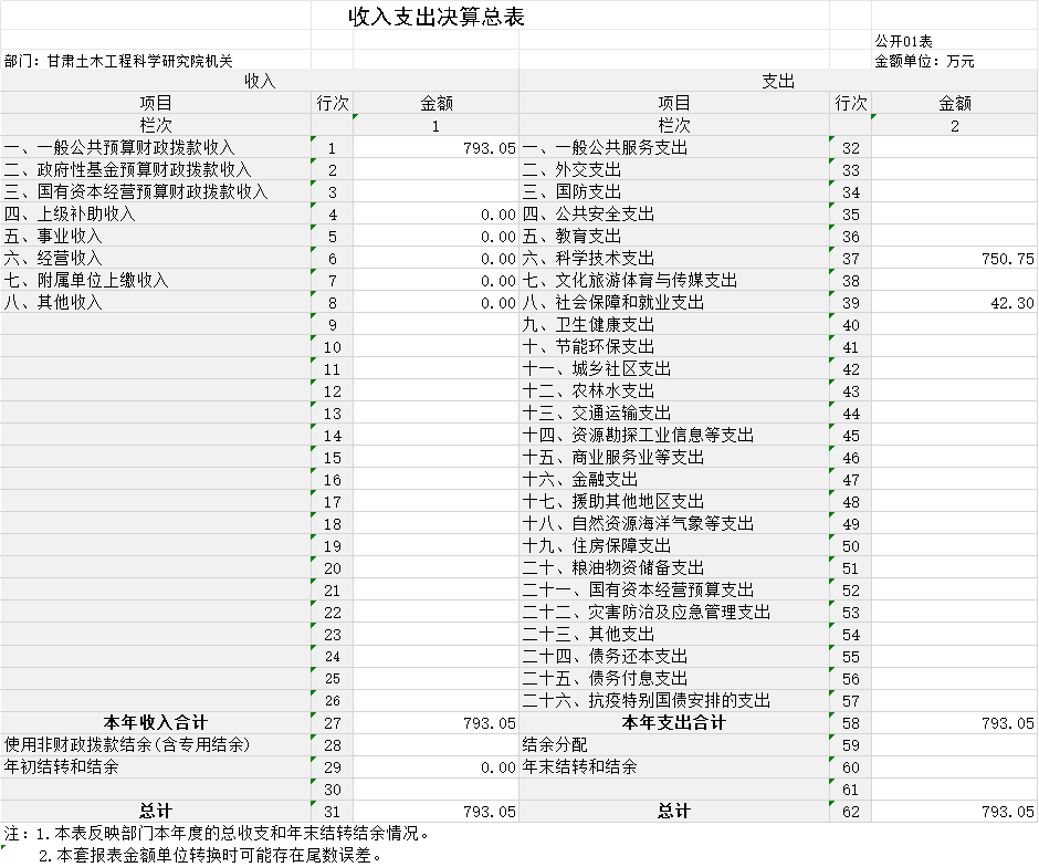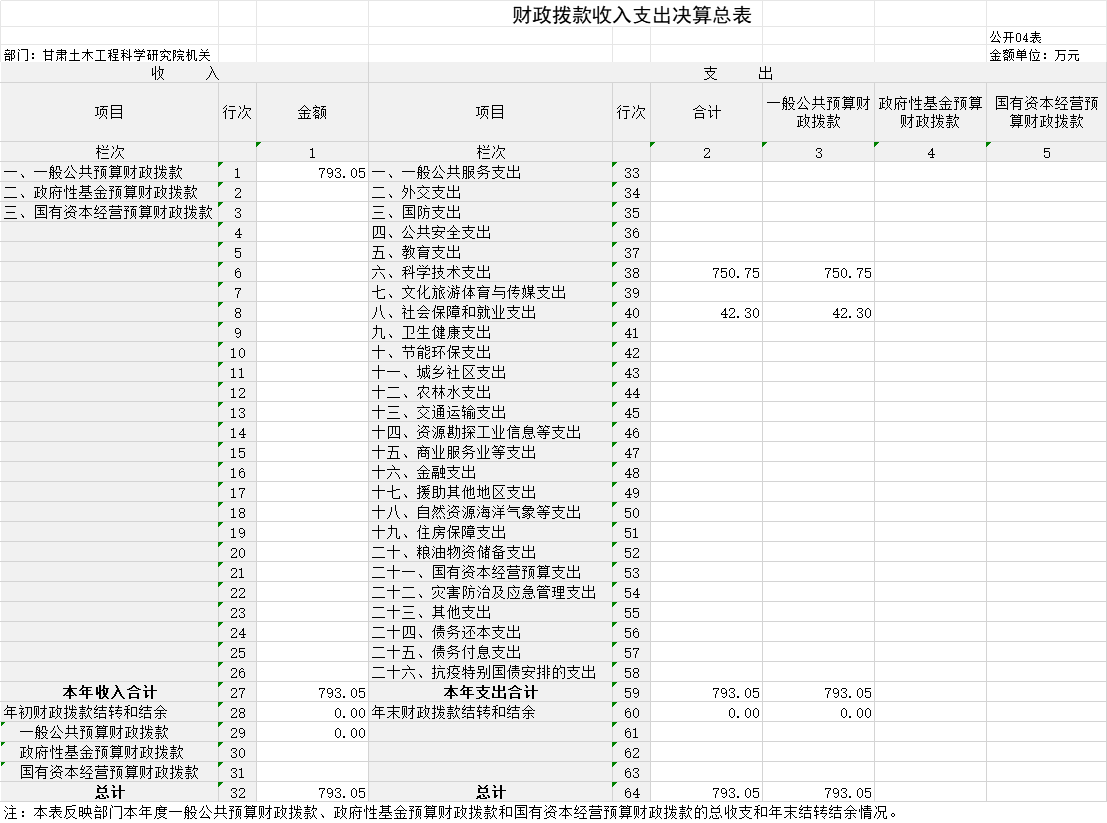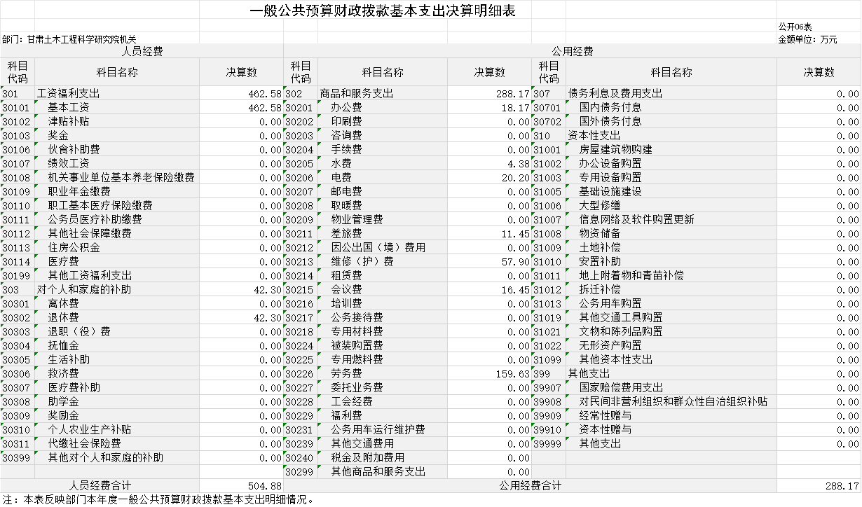 2023年度財政撥款收、支總計均為793.05萬元。與上年相比,各增加0.94萬元,增長0.12%。主要原因是社會保障和就業(yè)收、支較上年增加0.94萬元。其中:科研機構人員經(jīng)費504.88萬元,占比63.66%;公用經(jīng)費288.17萬元,占比36.34%。
