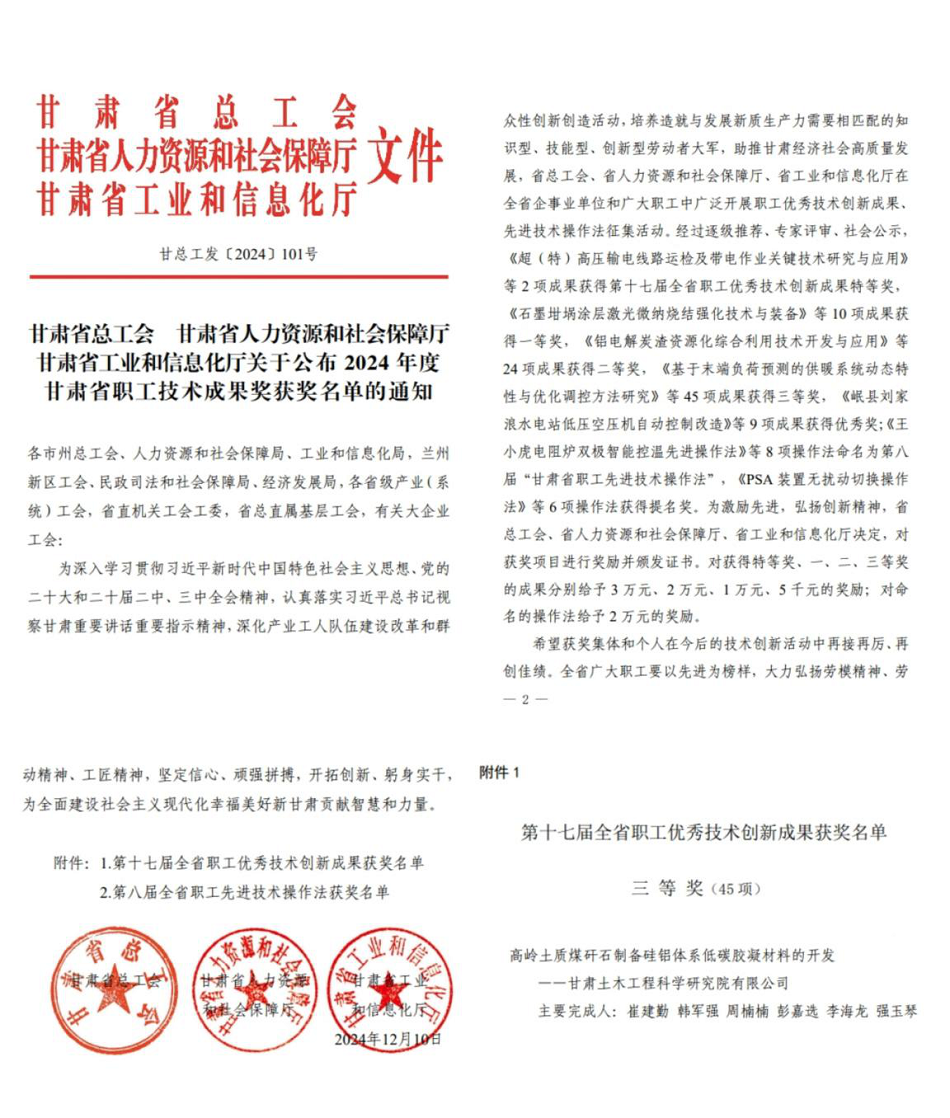 近日,甘肅省總工會(huì)、甘肅省人力資源和社會(huì)保障廳、甘肅省工業(yè)和信息化廳公布了2024年度甘肅省職工技術(shù)成果獎(jiǎng)獲獎(jiǎng)名單,公司材料科學(xué)與工程研究院崔建勤等同志完成的《高嶺土質(zhì)煤矸石制備硅鋁體系低碳膠凝材料的開(kāi)發(fā)》榮獲第十七屆全省職工優(yōu)秀技術(shù)創(chuàng)新成果三等獎(jiǎng)。