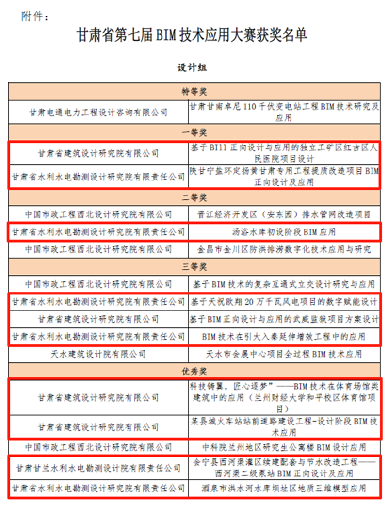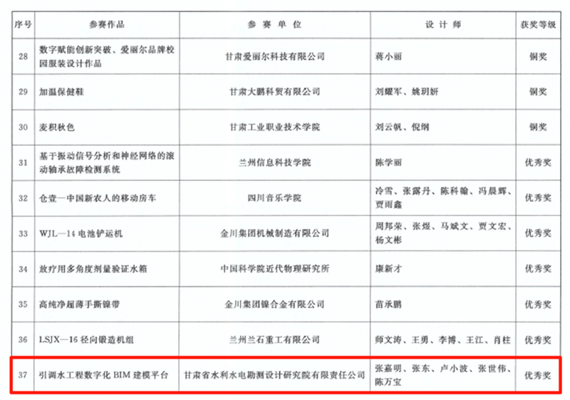 在甘肅省第七屆BIM技術應用大賽中,建筑設計院、水電設計院報送的項目共斬獲12項獎勵,包攬了設計組16個獎項中的10項。在甘肅省第五屆“創(chuàng)新杯”工業(yè)設計大賽中,水電設計院《引調水工程數(shù)字化BIM建模平臺》項目獲優(yōu)秀獎。在第十七屆全省職工優(yōu)秀技術創(chuàng)新成果獎中,水電設計院、土木工程院申報的兩個項目分獲創(chuàng)新成果獎三等獎,其中,《棄渣場三維設計平臺》項目是全省水利系統(tǒng)唯一獲獎成果。