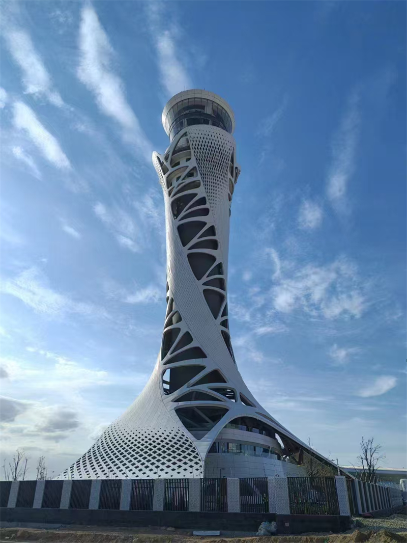 項(xiàng)目總投資13.43億元,塔臺建筑高度99.9米,是全國空管分局有史以來建設(shè)規(guī)模最大、投資最大的空管建設(shè)項(xiàng)目,創(chuàng)造了多項(xiàng)分局站建設(shè)第一。項(xiàng)目總體以“敦煌飛天”與“絲綢之路”為靈感,塔臺采用鋼結(jié)構(gòu)斜交網(wǎng)格外框+鋼筋混凝土核心筒設(shè)計(jì),空管工作區(qū)采用鋼筋混凝土框架+首層BRB支撐+基礎(chǔ)橡膠隔震支座設(shè)計(jì),鋼結(jié)構(gòu)總量達(dá)3561噸。