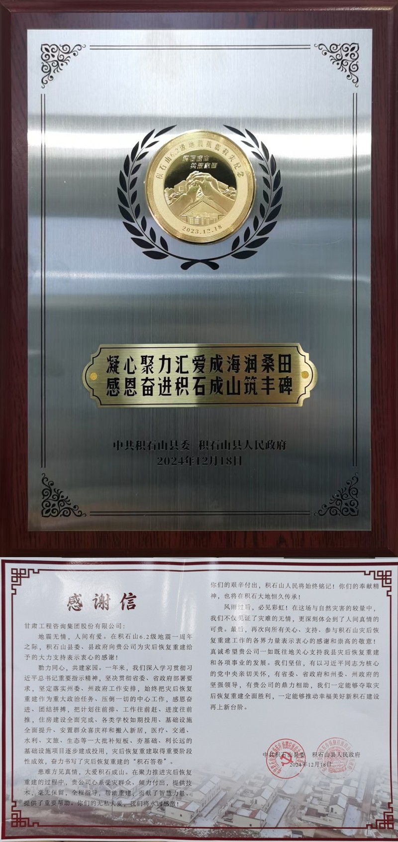 1月22日,時值北方農歷小年。中共積石山縣委、積石山縣人民政府為甘肅工程咨詢集團送來感謝信,對甘肅工程咨詢集團在災后恢復重建給予的大力支持表示感謝,并致以節(jié)日問候。