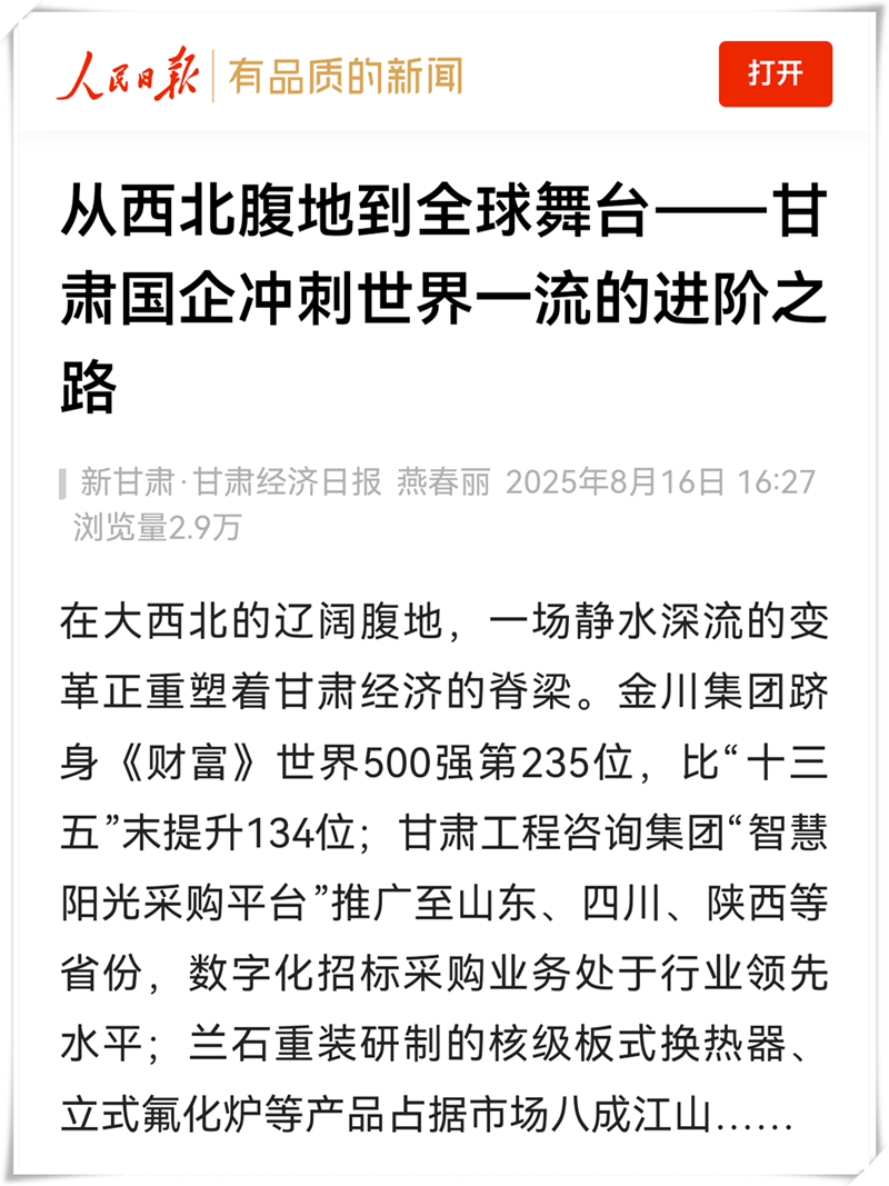人民日?qǐng)?bào)客戶端報(bào)道丨從西北腹地到全球舞臺(tái)——甘肅國(guó)企沖刺世界一流的進(jìn)階之路