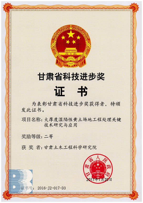 《大厚度濕陷性黃土場(chǎng)地工程處理關(guān)鍵技術(shù)研究與應(yīng)用》(2016年度甘肅省科技進(jìn)步二等獎(jiǎng))