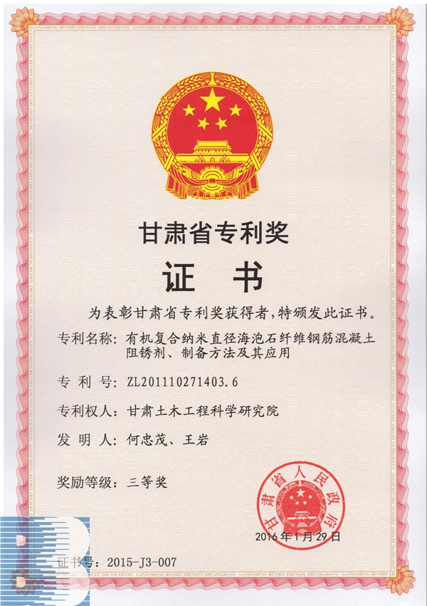 《有機(jī)復(fù)合納米直徑海泡石纖維鋼筋混凝土阻銹劑、制備方法及其應(yīng)用》(2015年度甘肅省專利獎(jiǎng)三等獎(jiǎng))